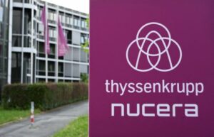 ARCHIV: Das Logo von Thyssenkrupp Nucera, einem der größten Börsengänge Europas in diesem Jahr, ist am Hauptsitz der Wasserstoffsparte von Thyssenkrupp zu sehen, in Dortmund, Deutschland, am 4. Juli 2023. REUTERS/Stephane Nitschke/File Photo