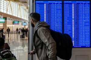 A traveller walks past departing flight information as American Airlines resumed its flights after a technical glitch forced the carrier to issue an hour-long ground stop, disrupting travel for thousands on Christmas Eve, one of the busiest periods of the year, at Ronald Reagan Washington National Airport in Arlington, Virginia, U.S. December 24, 2024. REUTERS/Anna Rose Layden