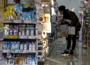 FILE PHOTO: A woman holding a shopping basket looks at items inside a discount drug store at Ginza shopping district in Tokyo, Japan, March 28, 2016. Picture taken March 28, 2016. REUTERS/Yuya Shino/File Photo