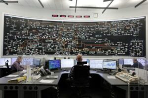 Alexis Delis, 59, Giorgos Zarmpoutis, 51, and Spyros Doukas, 42, dispatchers at Greece’s transmission system operator IPTO, work at the national control center, in Athens, Greece, December 17, 2024. REUTERS/Louiza Vradi