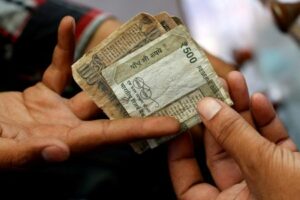 FILE PHOTO: A customer hands over Indian currency notes to a roadside currency exchange vendor in New Delhi, India, May 24, 2024. REUTERS/Priyanshu Singh/File Photo