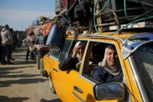 People react as Palestinians, who were displaced to the south at Israel’s order during the war, wait to head back to their homes in northern Gaza by vehicle through Salahudeen Road, amid a ceasefire between Israel and Hamas, in the central Gaza Strip, January 27, 2025. REUTERS/Hatem Khaled