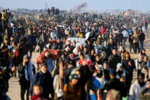Palestinians, who were displaced to the south at Israel’s order during the war, arrive on foot while making their way back to their homes in the northern Gaza, amid a ceasefire between Israel and Hamas, in Gaza City, January 27, 2025. REUTERS/Dawoud Abu Alkas