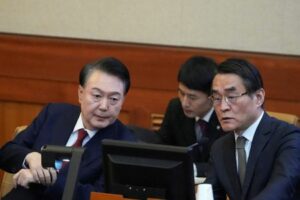 South Korea’s impeached President Yoon Suk Yeol, left, talks with one of his lawyers Bae Bo-yoon, right, upon his arrival for a hearing of his impeachment trial at the Constitutional Court in Seoul, South Korea, Tuesday, Feb. 11, 2025. Lee Jin-man/Pool via REUTERS