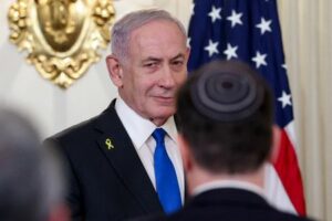 FILE PHOTO: Israeli Prime Minister Benjamin Netanyahu arrives for a joint press conference with U.S. President Donald Trump (not pictured) in the State Dining Room at the White House in Washington, D.C., U.S., September 29, 2025. REUTERS/Jonathan Ernst/File Photo