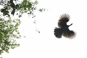 A Jacu bird flies at the Camocim coffee farm in Pedra Azul, Brazil, September 24, 2025. REUTERS/Alexandre Meneghini