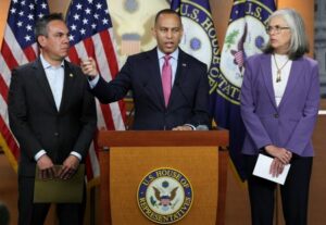 El líder de la minoría demócrata en la Cámara de Representantes, Hakeem Jeffries, junto al representante demócrata Pete Aguilar y la representante demócrata Katherine Clark, ofrece una rueda de prensa durante el primer día del cierre parcial del gobierno estadounidense, en el Capitolio de Washington, D.C., Estados Unidos, el 1 de octubre de 2025. REUTERS/Jonathan Ernst