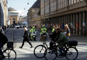 Vor dem informellen Treffen der Staats- und Regierungschefs der Europäischen Union fahren Radfahrer an Polizeibeamten in der Nähe von Schloss Christiansborg vorbei, Kopenhagen, Dänemark, 30. September 2025. REUTERS/Leonhard Foeger