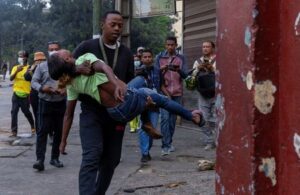 A man carries a protester who got injured during a demonstration against frequent power outages and water shortages, within Antaninandro neighbourhood, in Antananarivo, Madagascar, September 30, 2025. REUTERS/Zo Andrianjafy