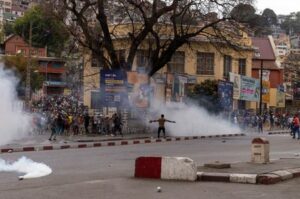 A protester gestures after Malagasy riot police officers lobbed teargas canisters to disperse them during a demonstration against frequent power outages and water shortages, within Antaninandro neighbourhood, in Antananarivo, Madagascar, September 30, 2025. REUTERS/Zo Andrianjafy