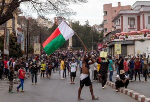 A protestor waves a Malagasy flag during a demonstration against frequent power outages and water shortages, within Antaninandro neighbourhood, in Antananarivo, Madagascar, September 30, 2025. REUTERS/Zo Andrianjafy