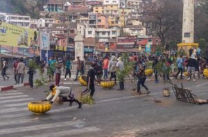 Protesters erect barricades on the road during a demonstration against frequent power outages and water shortages, within Antaninandro neighbourhood, in Antananarivo, Madagascar, September 30, 2025. REUTERS/Zo Andrianjafy