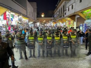 FOTO DE ARCHIVO. Miembros de las fuerzas de seguridad montan guardia mientras impiden que tenga lugar una protesta en demanda de reformas en educación y sanidad, en Rabat, Marruecos. 29 de septiembre de 2025. REUTERS/Ahmed El Jechtimi