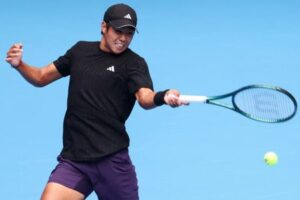 Tenis – Abierto de China – Centro Olímpico de Tenis de Pekín, Pekín, China – 1 de octubre de 2025. Learner Tien en acción durante su final contra Jannik Sinner. REUTERS/Maxim Shemetov