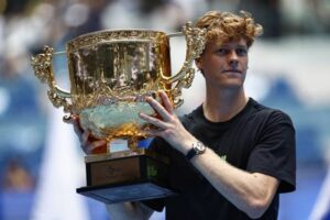 Tenis – Abierto de China – Centro Olímpico de Tenis de Pekín, Pekín, China – 1 de octubre de 2025. Jannik Sinner celebra con el trofeo después de ganar la final contra Learner Tien. REUTERS/Tingshu Wang
