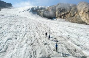 A drone view shows glaciologist Matthias Huss of ETH Zurich and his colleagues Lander van Tricht and Andreas Linsbauer walking on the Gries glacier during a field trip, amid the impact of climate change, in Obergoms, Switzerland, September 11, 2025. REUTERS/Denis Balibouse