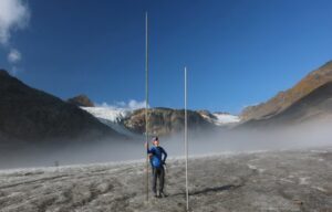 Glaciologist Huss of ETH Zurich holds a pole marking the