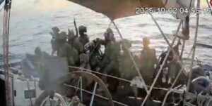 A screengrab from a live stream video shows people in uniform surround the Gaza-bound vessel All In, part of the Global Sumud Flotilla, which flotilla organisers report has been intercepted, October 2, 2025. Global Sumud Flotilla/Handout via REUTERS