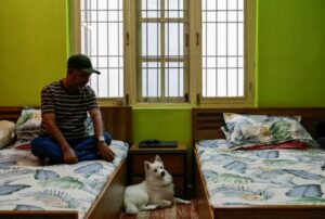 Ganesh Prasad Chaulagain, father of Shreeyam Chaulagain, who died after sustaining a gunshot injury to his head during anti-corruption protests that toppled the government, looks toward Jojo, a pet dog brought home by his son, as they sit next to his empty bed at a rented apartment where Ganesh lives with his family, in Kathmandu, Nepal October 1, 2025. REUTERS/Navesh Chitrakar