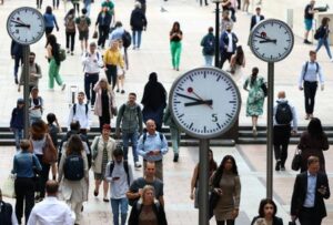 Workers walk through the Canary Wharf financial district, ahead of a Bank of England decision on interest rate changes, in London, Britain, August 3, 2023. REUTERS/Toby Melville