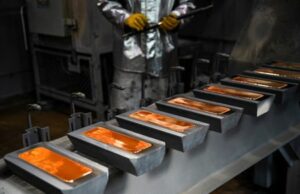 An employee casts ingots of 99.99 percent pure gold in a workroom during production at Krastsvetmet precious metals plant in the Siberian city of Krasnoyarsk, Russia, May 23, 2024. REUTERS/Alexander Manzyuk