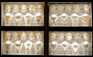 Gold necklaces are on display inside a jewellery showroom on the occasion of Akshaya Tritiya, a major gold buying festival, in Mumbai, India April 18, 2018. REUTERS/Francis Mascarenhas