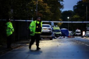 Agentes de policía vigilan el cordón policial frente a la sinagoga de Mánchester, donde varias personas fueron asesinadas durante Yom Kipur en lo que la policía declaró un incidente terrorista, en el norte de Mánchester, Reino Unido. 3 de octubre de 2025. REUTERS/Phil Noble