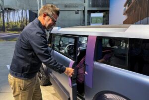 Dacia Design Director David Durand opens the door using a strap instead of the traditional handle on the “Hipster Concept”, a mini-EV concept car, unveiled by Dacia during a presentation in Meudon, near Paris, France, September 30, 2025. REUTERS/Gilles Guillaume