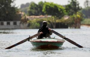 A woman rows her boat after flooding in Dalhamo Village, near the Delta city of Ashmoun, in Menoufia Governorate, Egypt, October 5, 2025. Egypt’s Prime Minister Mostafa Madbouly said the government had anticipated the rise in water levels, which coincides with the flood season and Ethiopia’s inauguration of its dam. He said higher-than-usual discharges are expected until the end of October, adding that the flooded areas in Menoufia and Beheira are part of the Nile’s flood zone and have been encroached upon by some citizens. REUTERS/Mohamed Abd El Ghany