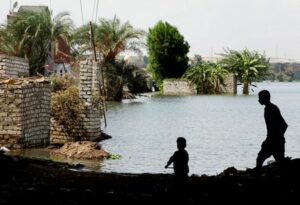 Children walk by their flooded homes in Dalhamo Village, near the Delta city of Ashmoun, in Menoufia Governorate, Egypt, October 5, 2025. Egypt’s Prime Minister Mostafa Madbouly said the government had anticipated the rise in water levels, which coincides with the flood season and Ethiopia’s inauguration of its dam. He said higher-than-usual discharges are expected until the end of October, adding that the flooded areas in Menoufia and Beheira are part of the Nile’s flood zone and have been encroached upon by some citizens. REUTERS/Mohamed Abd El Ghany