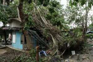 A fallen tree sits atop a house following heavy rain and strong winds on Friday, in Bangkok, Thailand, October 4, 2025. REUTERS/Chalinee Thirasupa
