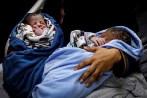 Palestinian woman Iman Abdel Halim Abu Mutlaq holds her newborn twins Uday and Hamza Abu Odah inside the maternity ward at Nasser hospital, in Khan Younis in the southern Gaza Strip, November 2, 2023. Uday and Hamza were born on 2 November 2023, less than four weeks after the Hamas attack that triggered Israel’s devastating assault on Gaza that has defined and encompassed their brief lives. They have lost their home and lived in tents and on the street. Their father was killed seeking aid and two brothers were wounded. They have suffered constant hunger, frequent bouts of sickness and repeated episodes of terrifying bombardment. Their mother is frightened that the longer Israel’s assault goes on, the more they – and the new generation of Gazans – will be scarred. “We are afraid this war will never stop, that it has a beginning and no end,” she said. REUTERS/Mohammed Salem SEARCH “GAZA TWINS ODAH” FOR THIS STORY. SEARCH “WIDER IMAGE” FOR ALL STORIES.