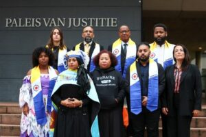 Activists protest in front of the district court, which hears a case brought by Greenpeace Netherlands and residents of the Dutch-Caribbean island of Bonaire, to force the Netherlands to take more measures to protect the island against the effects of climate change, in The Hague, Netherlands, October 7, 2025. Pictured: Marieke Vellekoop (R), head of Greenpeace Netherlands, ecologist Daniela Simal, Bonaire residents Angelo Vrolijk, Onnie Emerenciana, Kjelld Kroon, Danique Martis, Jackie Bernabela, Helen Angela and Judmar Emerenciana. REUTERS/Piroschka van de Wouw