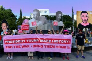 People hold posters of Israeli hostages, and a banner, calling on U.S. President Donald Trump to end the war and return the hostages, on the two-year anniversary of the deadly October 7, 2023 attack on Israel by Hamas from Gaza, in Tel Aviv, Israel, October 7, 2025. REUTERS/Tomer Neuberg