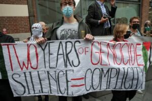 Students hold signs as they take part in an inter-university march in support of Palestinians, on the second anniversary of the deadly October 7, 2023 attack on Israel by Hamas from Gaza, in London, Britain, October 7, 2025. REUTERS/Toby Melville