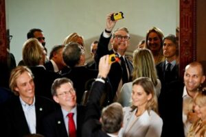 British Prime Minister Keir Starmer takes a selfie with a disposable camera during an interaction with business leaders at the Taj Mahal Palace in Mumbai, India, October 8, 2025. Leon Neal/Pool via REUTERS