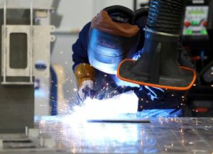 FILE PHOTO: A welder works in the welding bay at Rheinmetall Bae Systems Land (RBSL) where production of the new mechanised infantry vehicle begins in Telford, Britain, March 27, 2023. REUTERS/Molly Darlington/File Photo