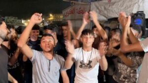 Palestinians celebrate on a street following the news that Israel and Hamas have agreed on Wednesday to the first phase of U.S. President Donald Trump’s plan for Gaza, in Khan Younis in the southern Gaza Strip, in this screengrab obtained from a video released on October 9, 2025. Video Obtained by REUTERS