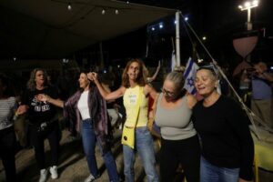 People celebrate, after U.S. President Donald Trump announced that Israel and Hamas agreed on the first phase of a Gaza ceasefire, at the “Hostages square”, in Tel Aviv, Israel, October 9, 2025. REUTERS/Ronen Zvulun
