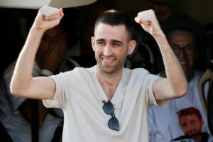 Released hostage Avinatan Or, who was kidnapped during the deadly October 7, 2023 attack by Hamas and taken to Gaza, reacts upon arrival at the site of Rabin Medical Center-Beilinson Hospital, amid a hostages-prisoners swap and a ceasefire deal between Israel and Hamas in Gaza, in Petah Tikva, Israel October 13, 2025. REUTERS/Stoyan Nenov