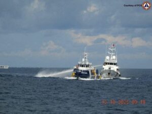 A China Coast Guard vessel 21559 uses a water cannon against Philippines Bureau of Fisheries and Aquatic Resources ship BRP Datu Pagbuaya in the South China Sea, in this handout image released by the Philippine Coast Guard on October 12, 2025. Philippine Coast Guard/Handout via REUTERS.