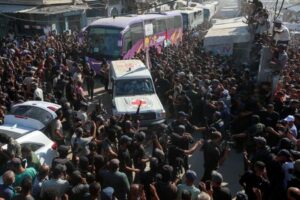People gather at Nasser hospital to welcome freed Palestinian prisoners released by Israel as part of a hostages-prisoners swap and a ceasefire deal between Hamas and Israel, in Khan Younis in the southern Gaza Strip, October 13, 2025. REUTERS/Ramadan Abed