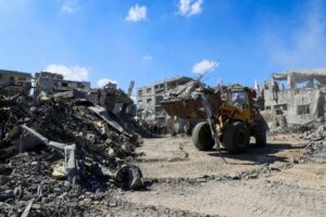 Maquinaria pesada retira escombros de una calle durante un alto el fuego entre Israel y Hamás, en la ciudad de Gaza. 14 de octubre de 2025. REUTERS/Ebrahim Hajjaj