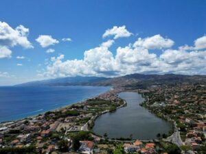 FILE PHOTO: A drone view shows Lake Ganzirri and the Sicilian coast visible across the Strait of Messina, part of the planned site for construction of a suspension bridge connecting Sicily to mainland Italy, with construction expected to be completed in 2032, in Messina, Italy, August 6, 2025. REUTERS/Yara Nardi/File Photo