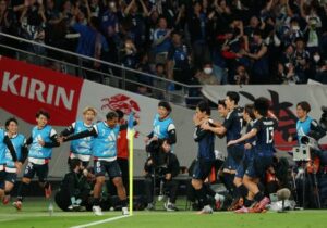 Fútbol – Amistoso Internacional – Japón vs Brasil – Estadio de Tokio, Tokio, Japón – 14 de octubre de 2025 El japones Ayase Ueda celebra el tercer gol con sus compañeros REUTERS/Kim Kyung-Hoon