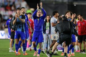 Jugadores de Argentina celebran tras golear a Puerto Rico en partido de preparación para la Copa del Mundo. Estadio Chase, Fort Lauderdale, Florida, EEUU. 14 de octubre de 2025.