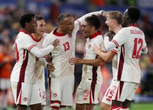 FOTO DE ARCHIVO. Derek Cornelius, de Canadá, celebra el primer gol con sus compañeros de equipo, ern un partido amistoso contra Gales, en el Estadio Swansea, Swansea, Gales, Gran Bretaña , 9 de septiembre, 2025. Imágenes de Action Images vía REUTERS/Paul Childs