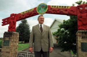 FILE PHOTO: New Zealand Prime Minister Jim Bolger stands at the gates of Te Kuiti’s primary School under a Maori ceremonal gateway after voting in his electorate of Taranaki/King Country October 12