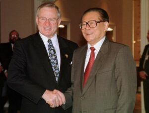 FILE PHOTO: President Jiang Zemin of China (R) shakes hands with New Zealand’s Prime Minister Jim Bolger, before his bilateral meeting November 23. APEC SUMMIT/File Photo