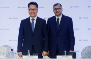 Unsoo Kim, Managing Director of Hyundai Motor India Limited, and Tarun Garg, Chief Operating Officer of Hyundai Motor India Limited, pose for pictures during a press conference, ahead of the company’s IPO launch, in Mumbai, India, October 9, 2024. REUTERS/Francis Mascarenhas